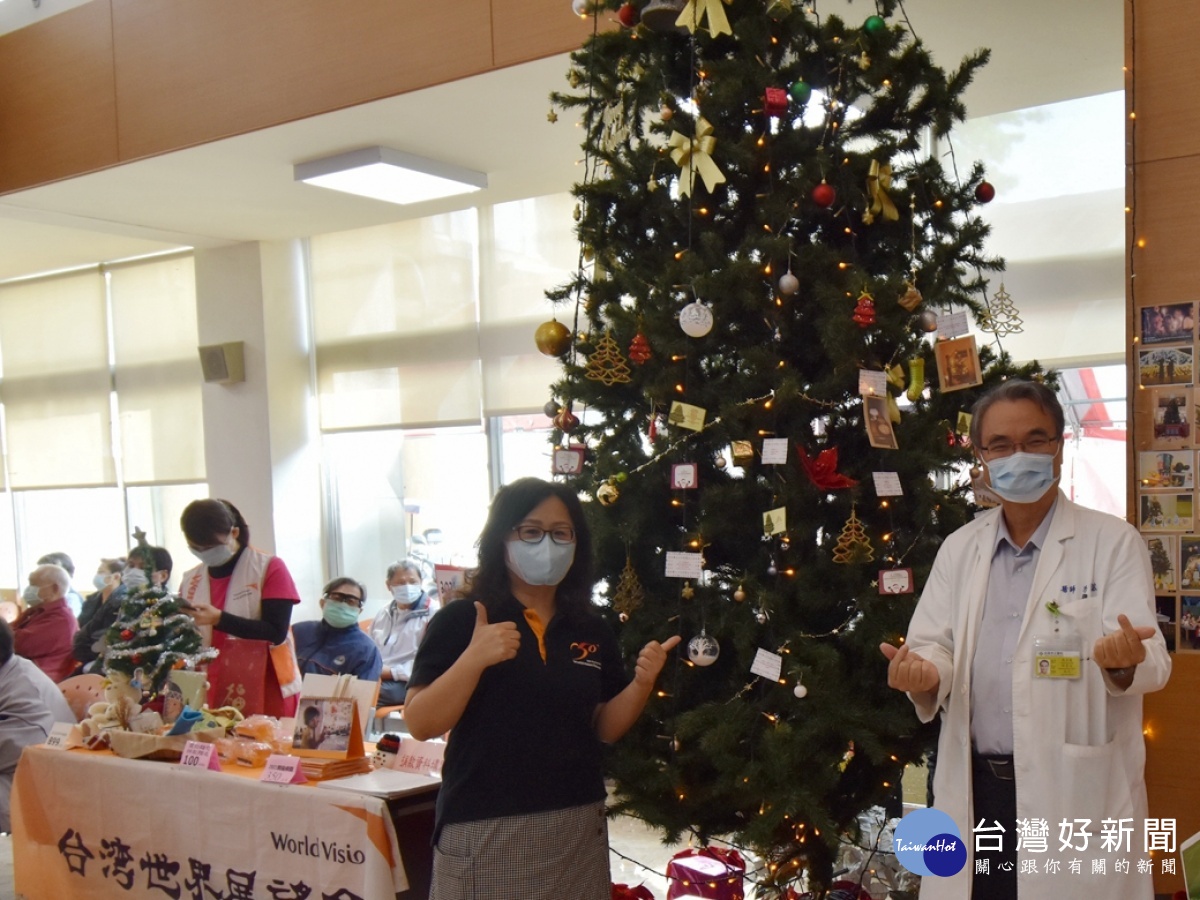 「聖誕祝福 醫起集愛」活動,由蔡良敏院長與世界展望會南區辦事處黃美珍組長共同點亮聖誕樹上無限祝福的燈,象徵點亮希望與愛,並發送聖誕節小禮物給民眾與同仁,一起分享這份祝福。