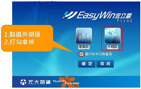 2.登入時建議將[顯示版本切換畫面]的勾勾拿掉>>再按[外期版]>>按[確定]